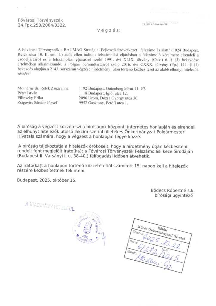 A Fővárosi Törvényszék végzése