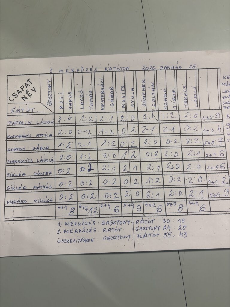 Mindkét összecsapást a gasztonyiak nyerték: Gasztony – Rátót 30-19, Rátót – Gasztony 24-25. Január 25-én, a Zöld Sasban lejátszott visszavágón, a gondosan vezetett eredménytáblázat szerint Laczó Tamás lett az egyéni bajnok, 12 győzelemmel. A kemény küzdelem után jól esett a főtt debreceni és a sör a megfáradt csapatoknak.